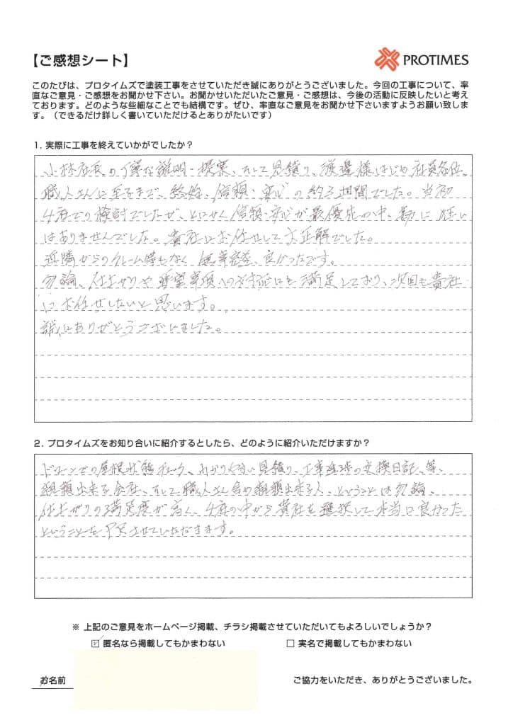 このたびは数ある施工会社の中からプロタイムズ西宮店をお選びいただき、誠にありがとうございました。また、お忙しい中このように温かいお言葉を頂戴し、社員一同心より感謝申し上げます。