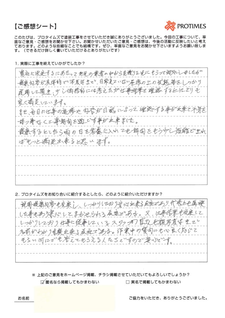 また、毎日の仕事の進捗や内容が日誌によって確認する事が出来て不安を持つ事なく工事期間を過ごすことが出来ました。