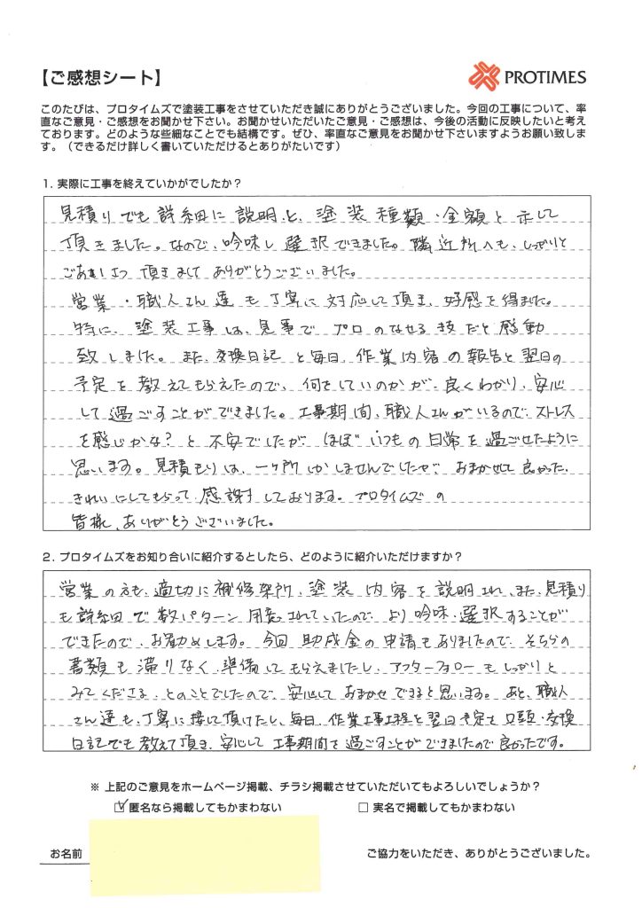 特に、塗装工事は見事で、プロのなせる技だと感動致しました。