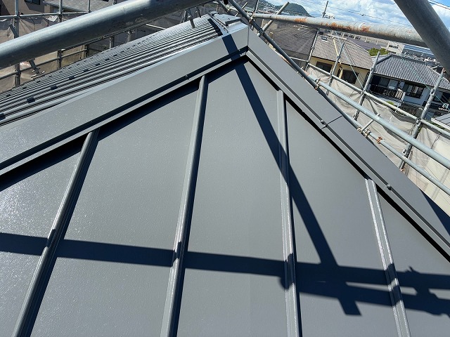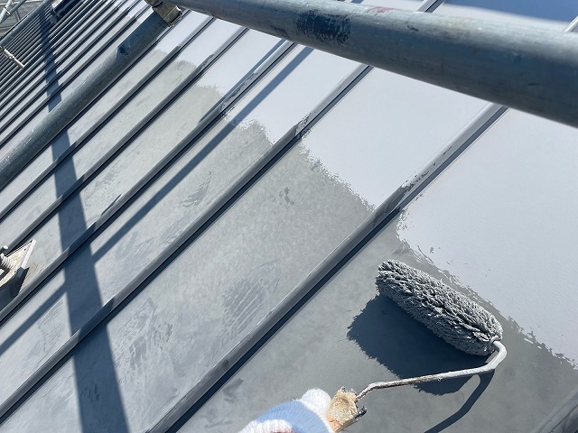 上塗り材「超低汚染リファイン500Si-IR」で2回上塗りを塗布して屋根塗装の完了です。