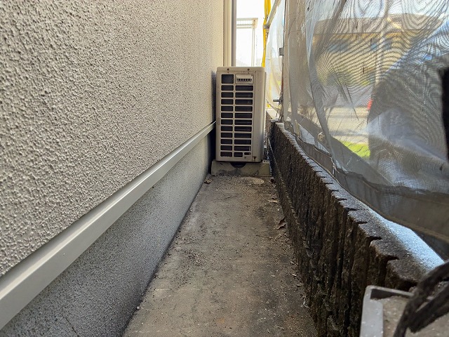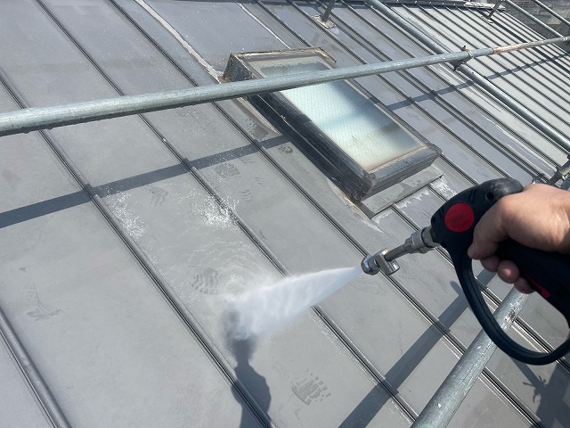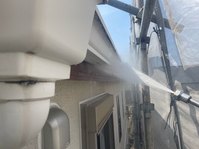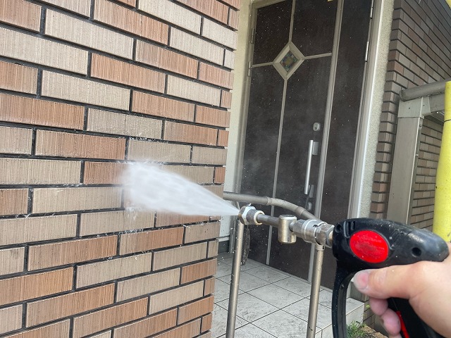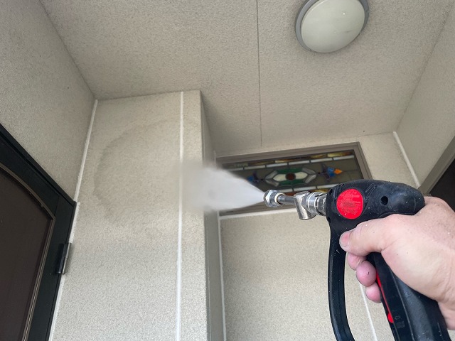 塗装工事の初めに、高圧洗浄機を使用してカビやホコリ等の汚れを落とします。