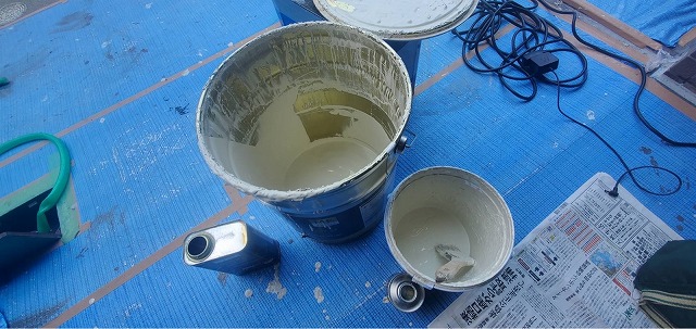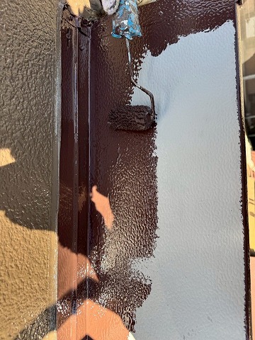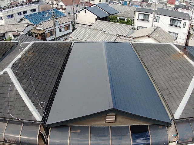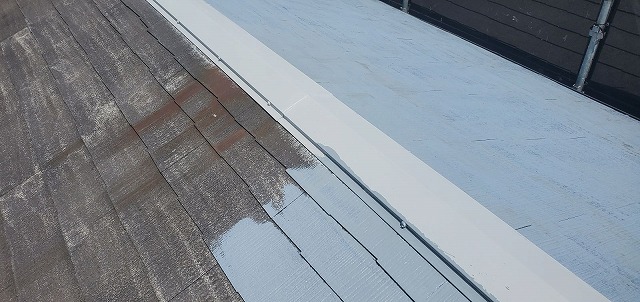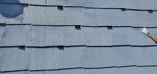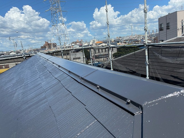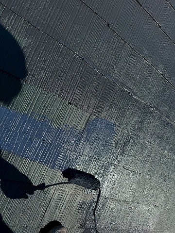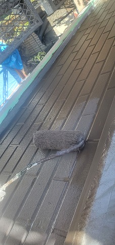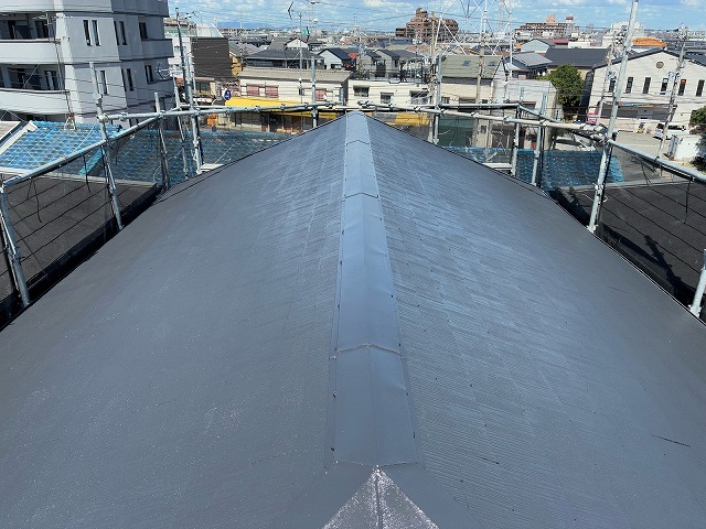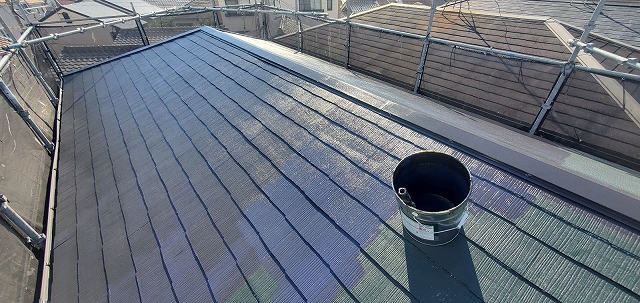 下塗り乾燥後、「超低汚染リファイン500MF-IR」で中塗り上塗りをして屋根塗装の完成です。
