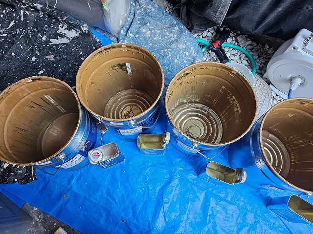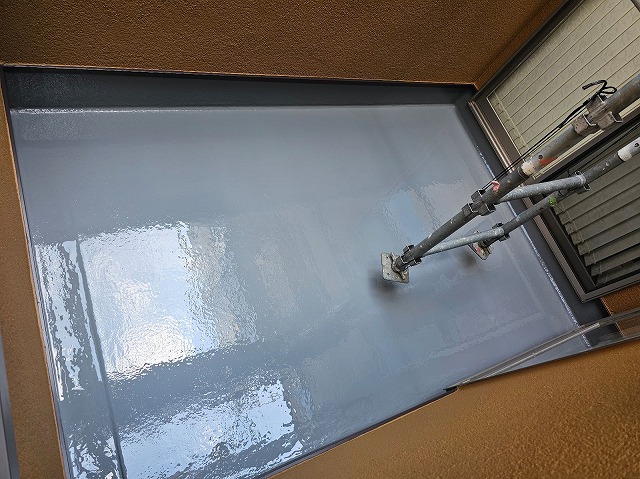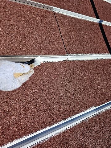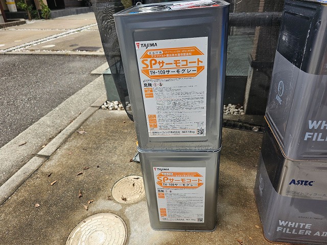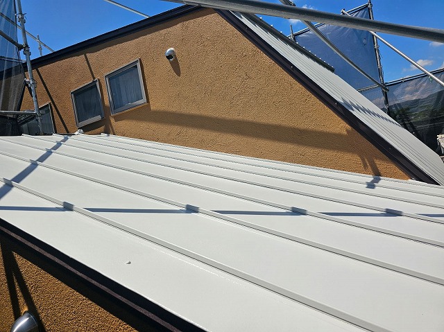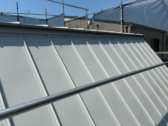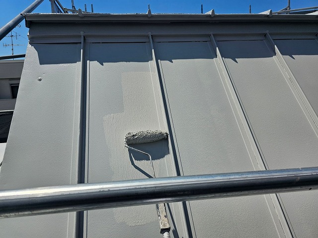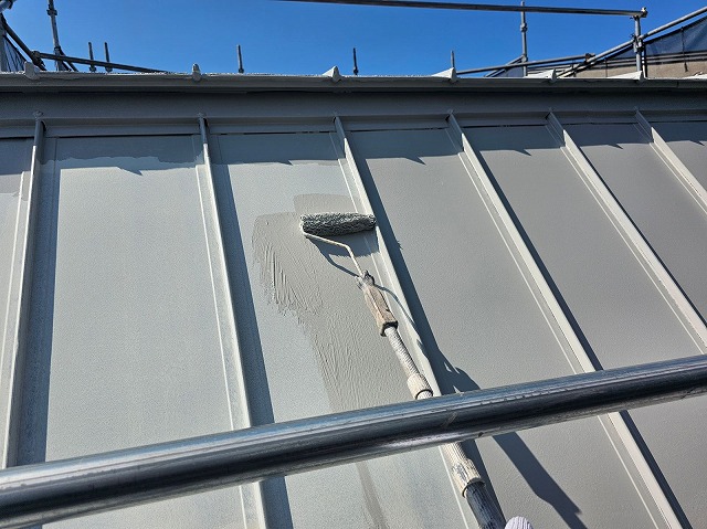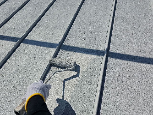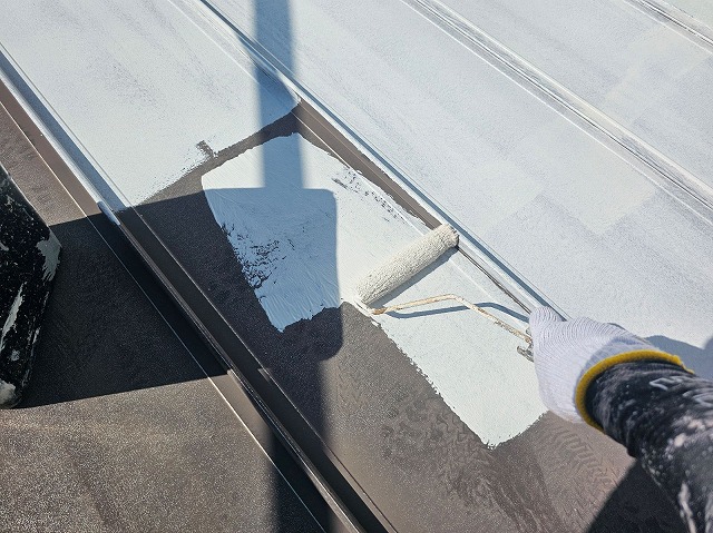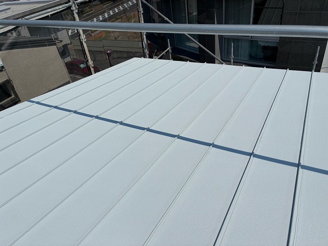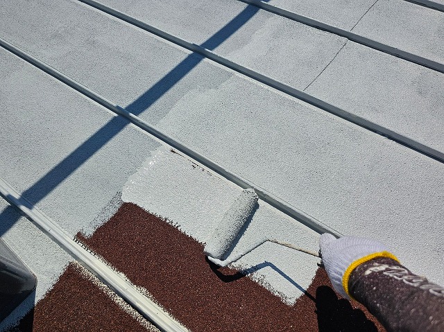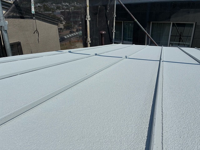 下塗り乾燥後、「超低汚染リファイン500無機-IR」で中塗り上塗りをして屋根塗装の完成です。