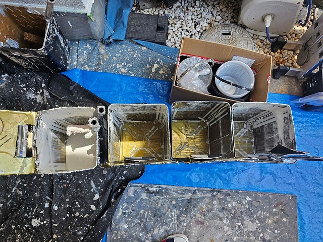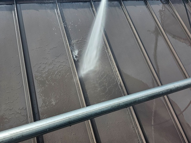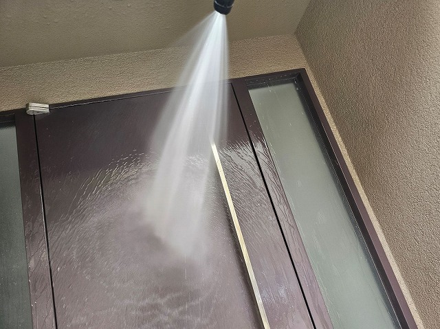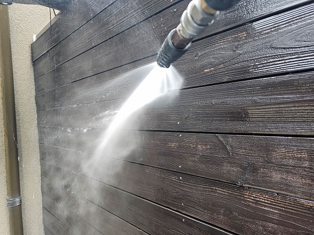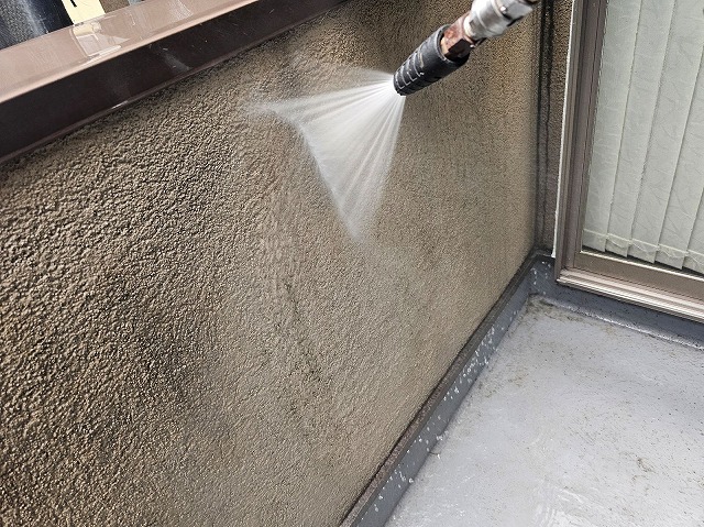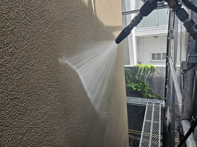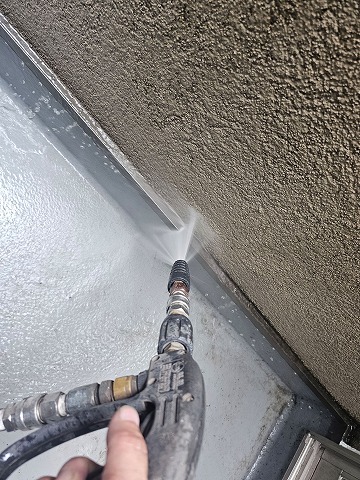 塗装工事の初めに、高圧洗浄機を使用してカビやホコリ等の汚れを落とします。