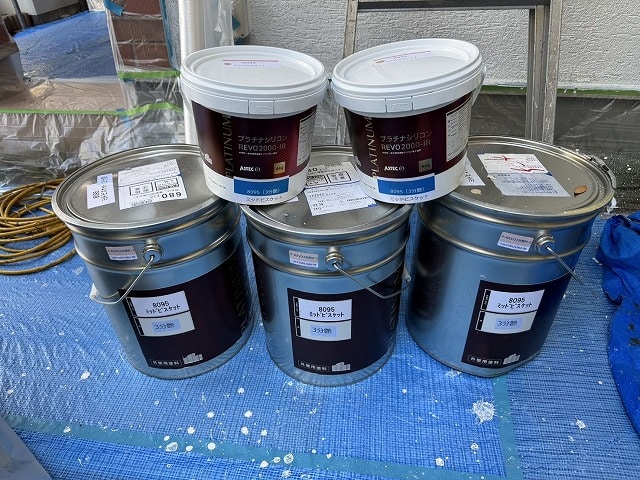 下塗り乾燥後、「プラチナシリコンREVO2000ーIR」で中塗り、上塗りをして外壁塗装の完成です。