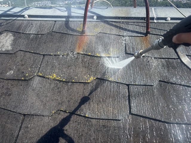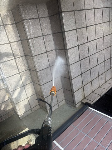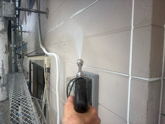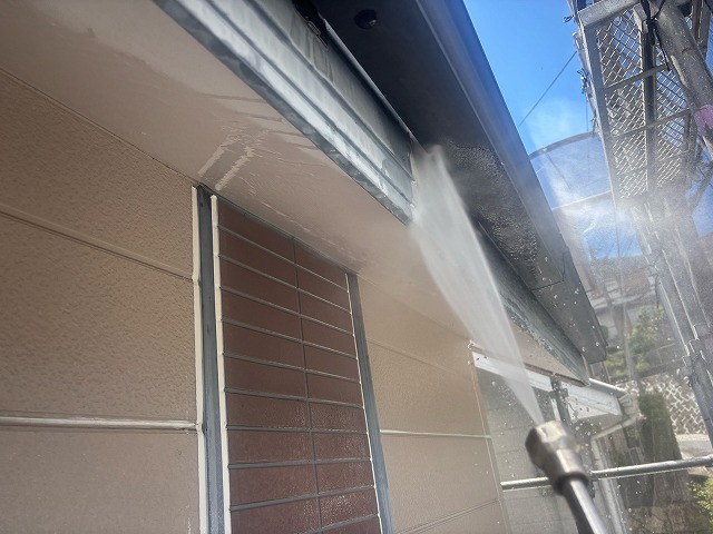 高圧洗浄は、外壁塗装前に行う重要な下地処理の一つです。長年蓄積されたホコリ・カビ・コケ・古い塗膜などの汚れを、専用の高圧洗浄機を使ってしっかりと除去します。これにより、塗料の密着性が高まり、仕上がりの美しさと耐久性が大きく向上します。