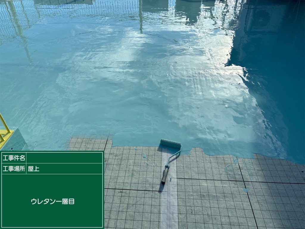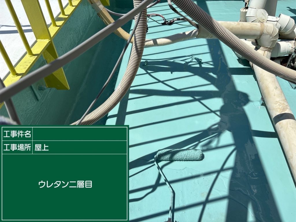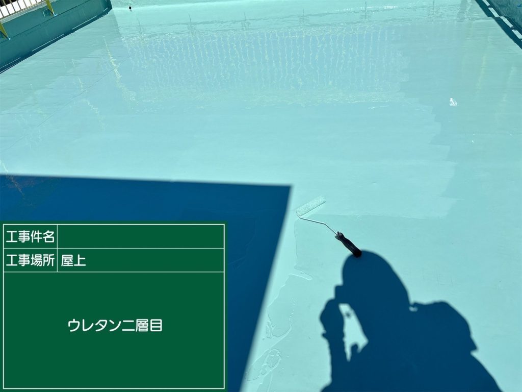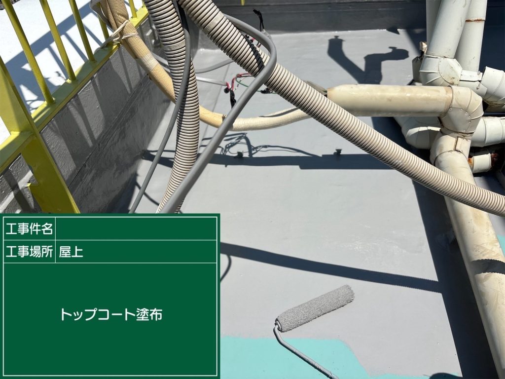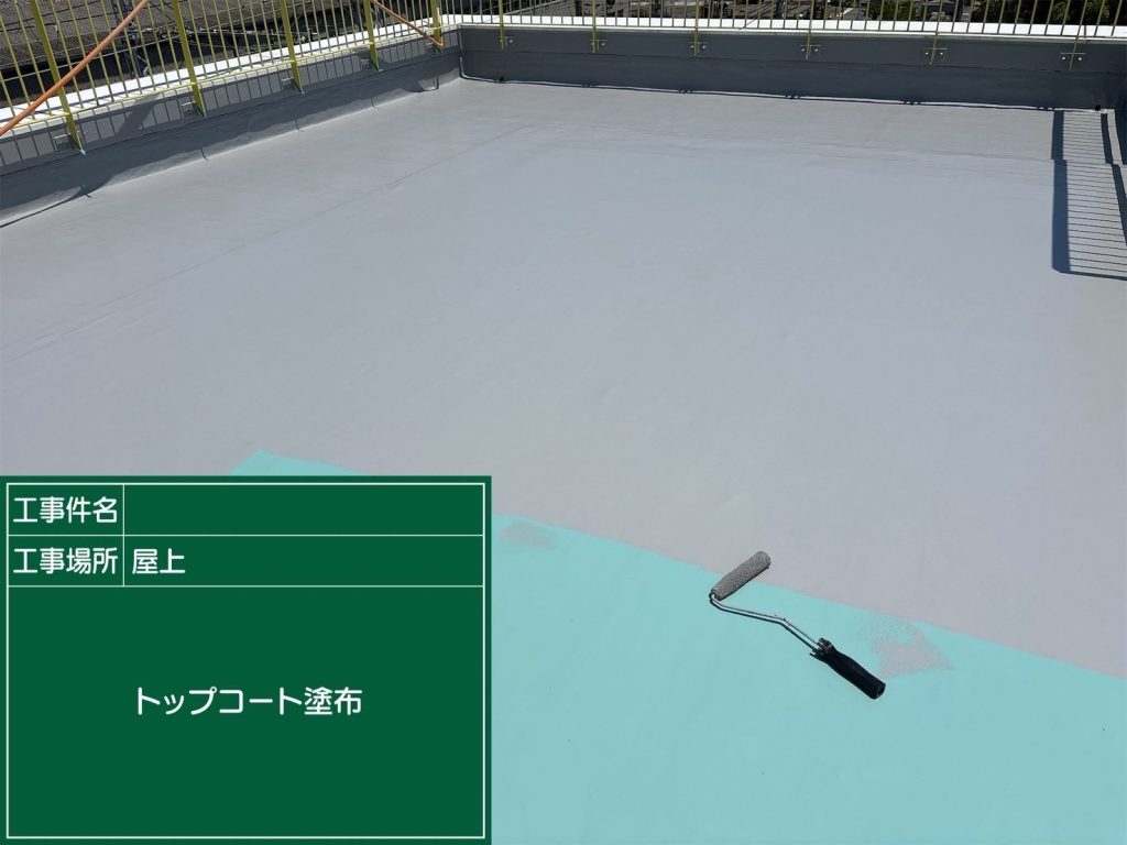 防水層の保護と耐候性向上のため、トップコートを塗布します。紫外線や雨風からウレタン層を守り、色や光沢を整えることで美観も向上させます。