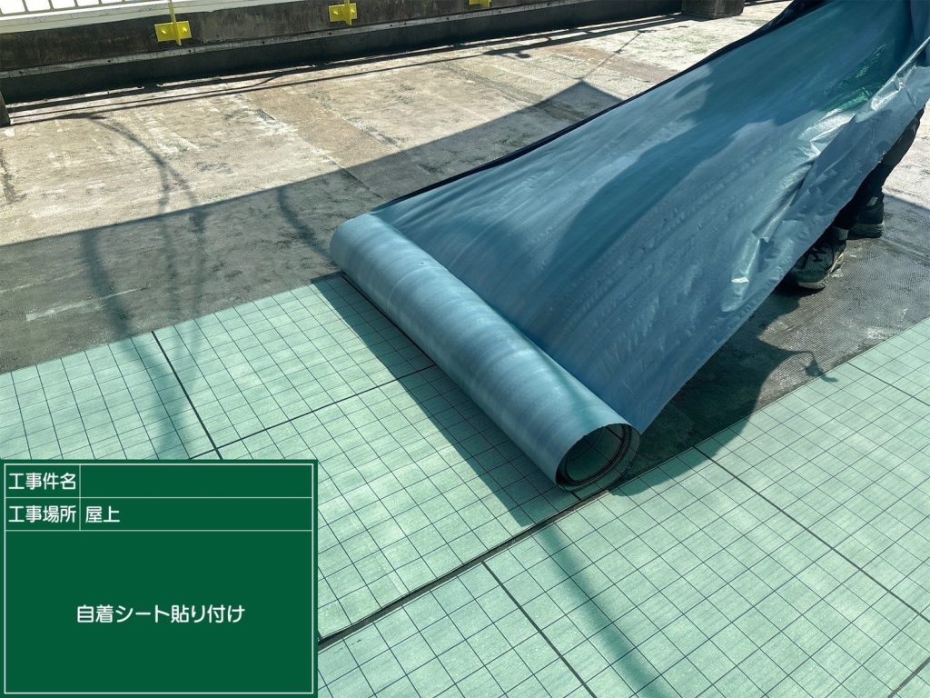 下地の補強と防水性能向上のために、自着シートを貼り付けます。自己粘着タイプのシートが下地に密着し、ひび割れや動きの応力を吸収することで、ウレタン塗膜防水の耐久性を高めます。