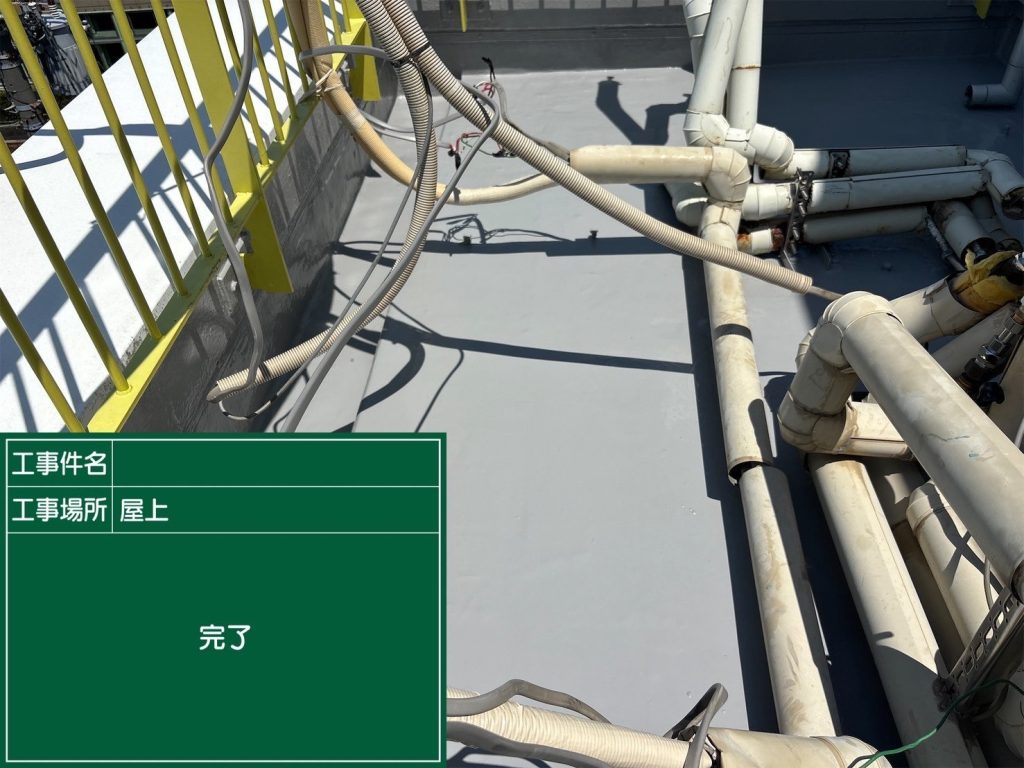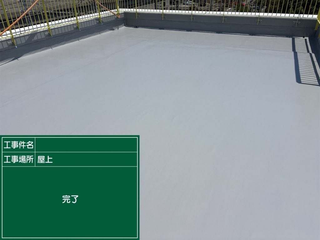 すべての工程が完了し、屋上防水工事が無事終了しました。下地補強からウレタン塗膜、トップコートまでの多層構造により、耐久性・防水性・美観が確保された屋上に仕上がりました。