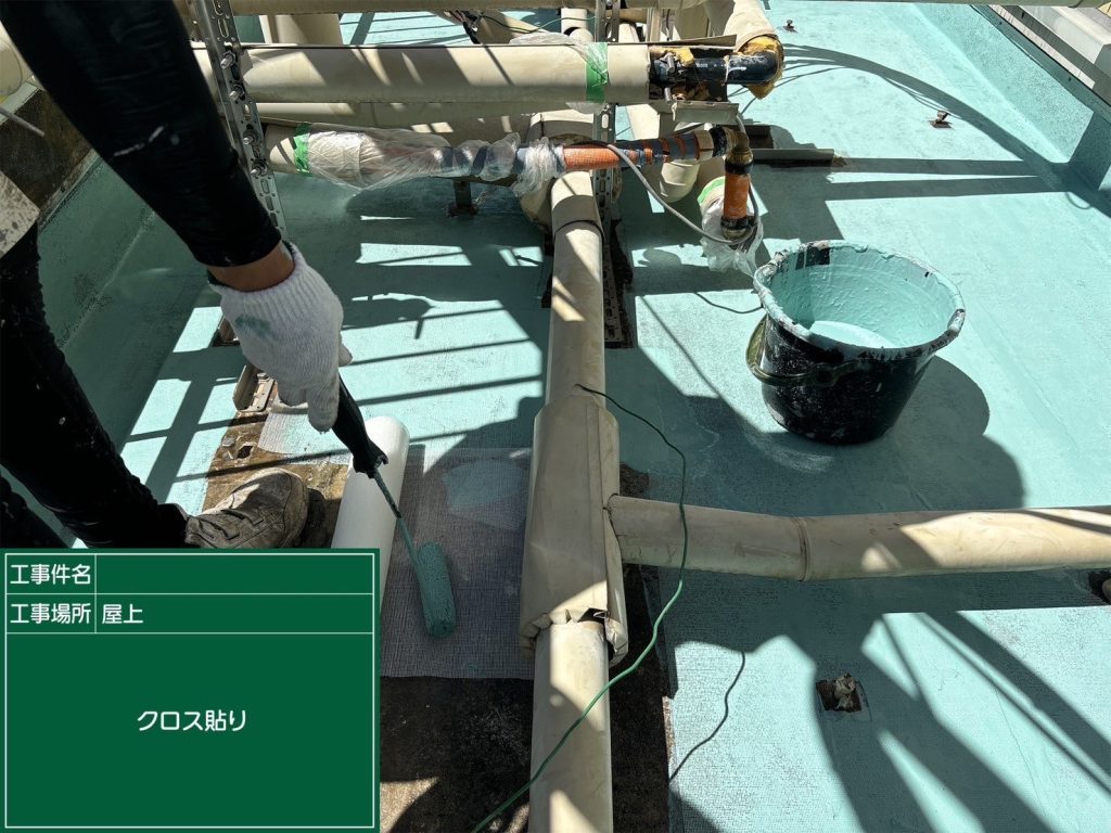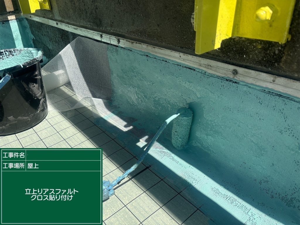 立ち上がり部分にはアスファルトクロスを貼付け、角や壁際の補強を行います。これにより防水層の強度を増し、屋上全体の耐久性と施工後の安心感を向上させます。