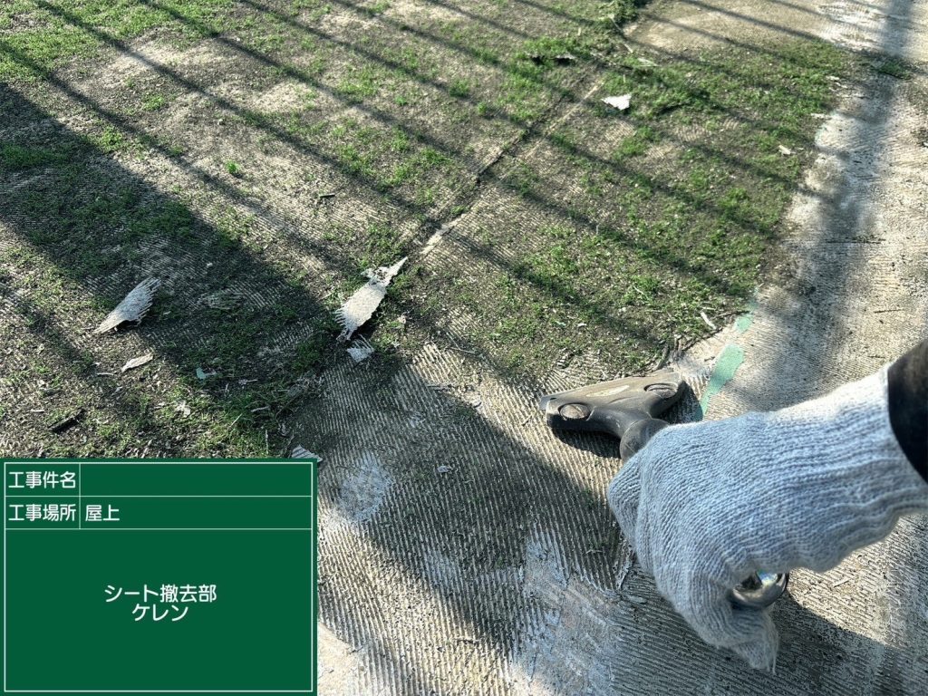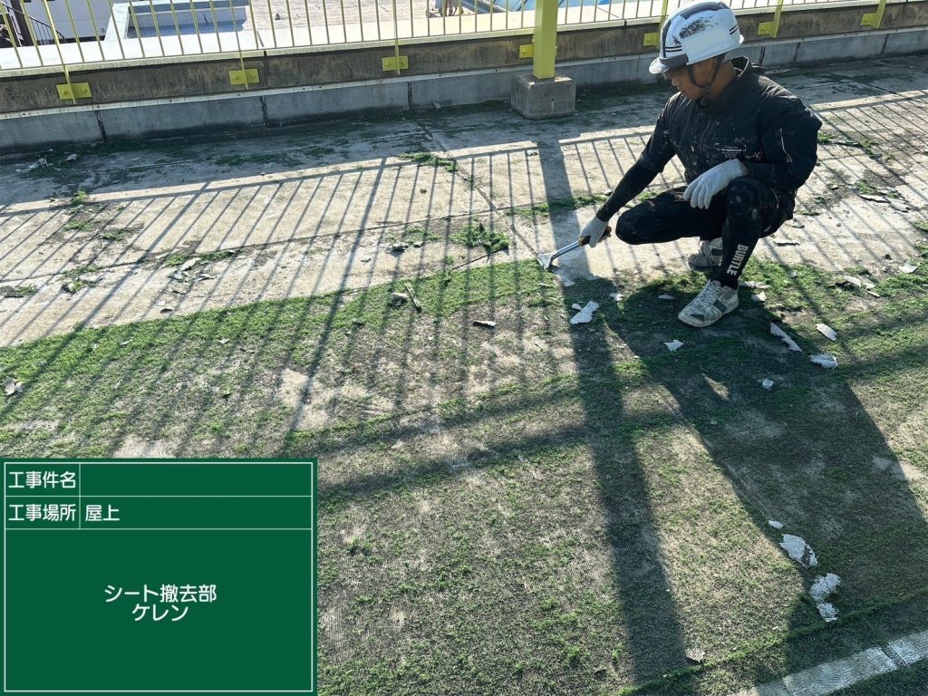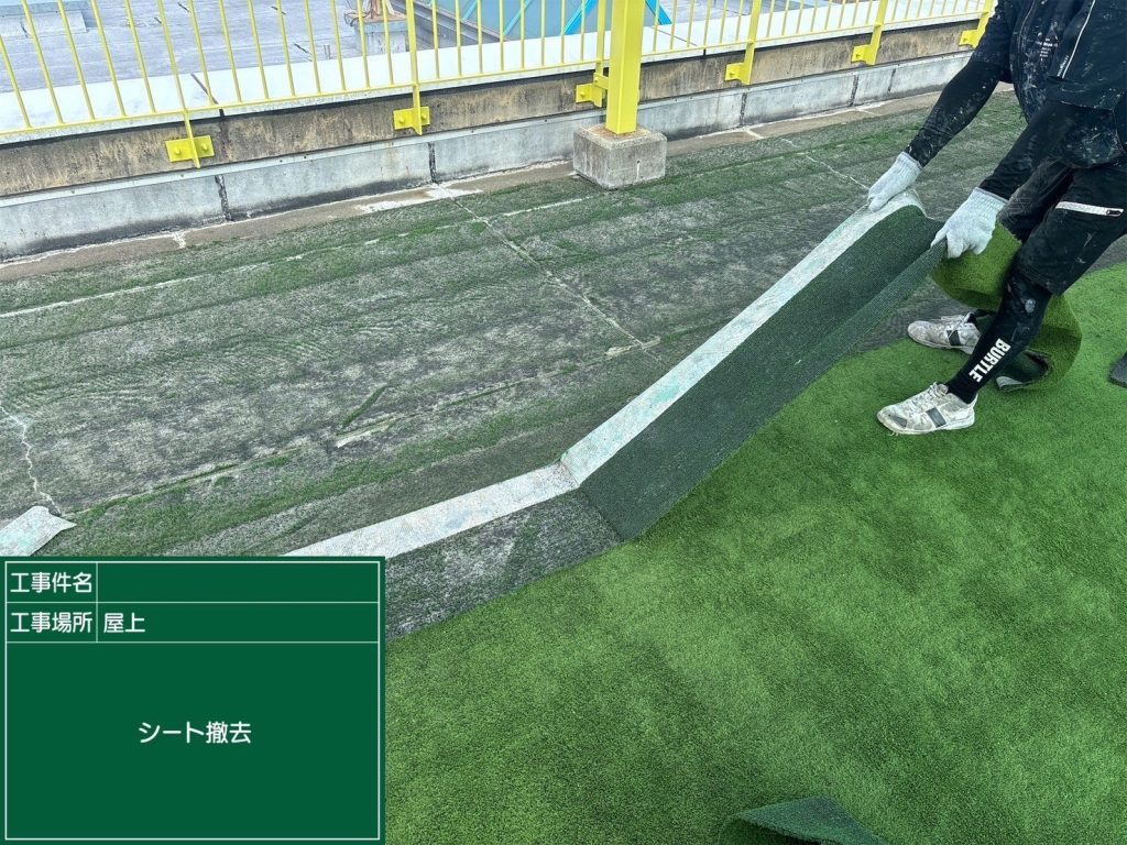 既存のシートを丁寧に撤去します。古いシートは接着や摩耗によって変形している場合があり、無理に剥がすと下地を傷める可能性があるため、慎重に手作業で剥がしていきます。撤去後には下地の状態をしっかり確認します。