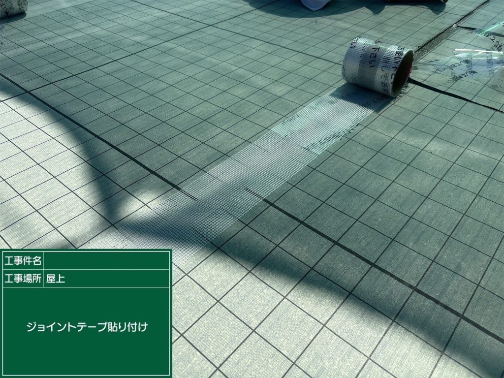 自着シートの接合部や端部にはジョイントテープを貼り付けます。重ね目や隙間からの水の侵入を防ぎ、防水層全体の一体性を保つ重要な工程です。