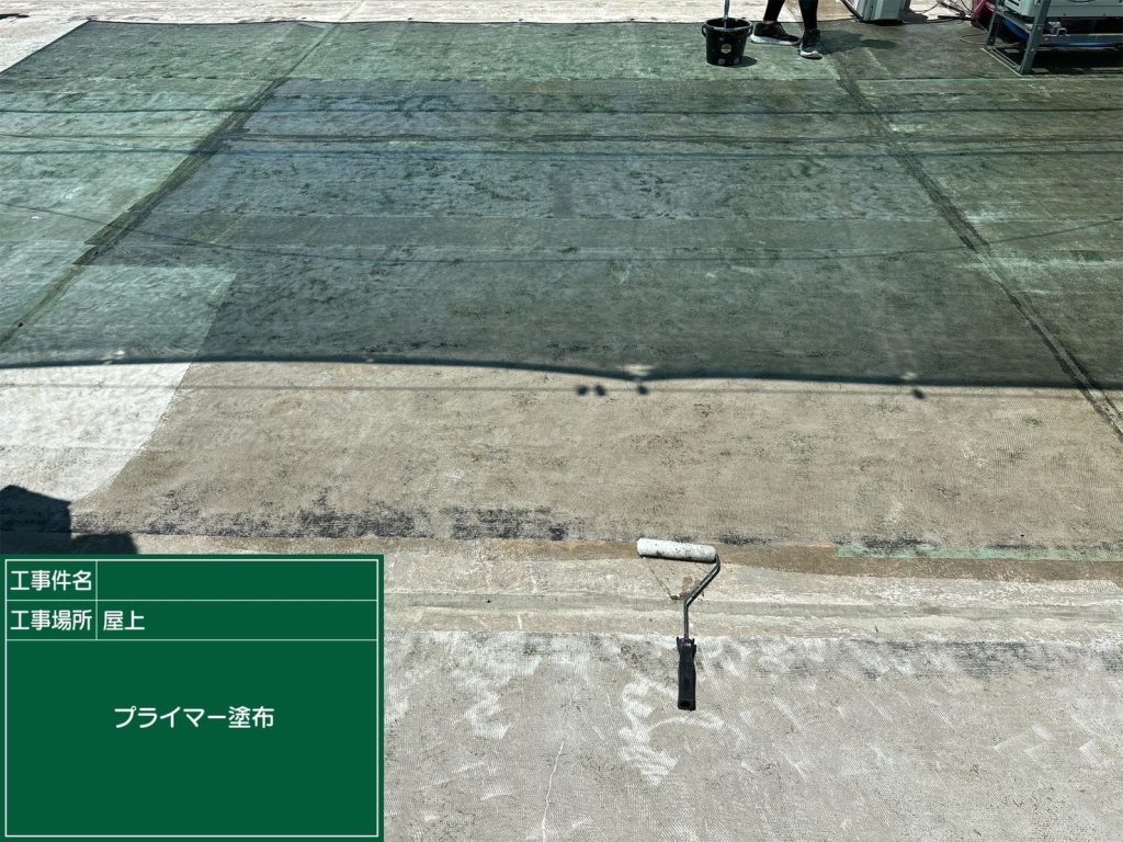 下地にプライマーを塗布して接着性を向上させます。プライマーは防水層と下地を密着させる役割を持ち、塗布することでウレタン塗膜や自着シートがしっかり定着し、長期の防水性能を確保します。
