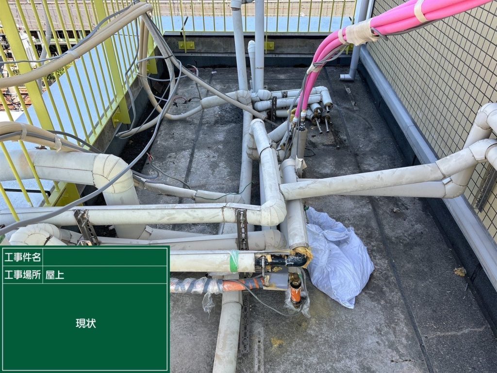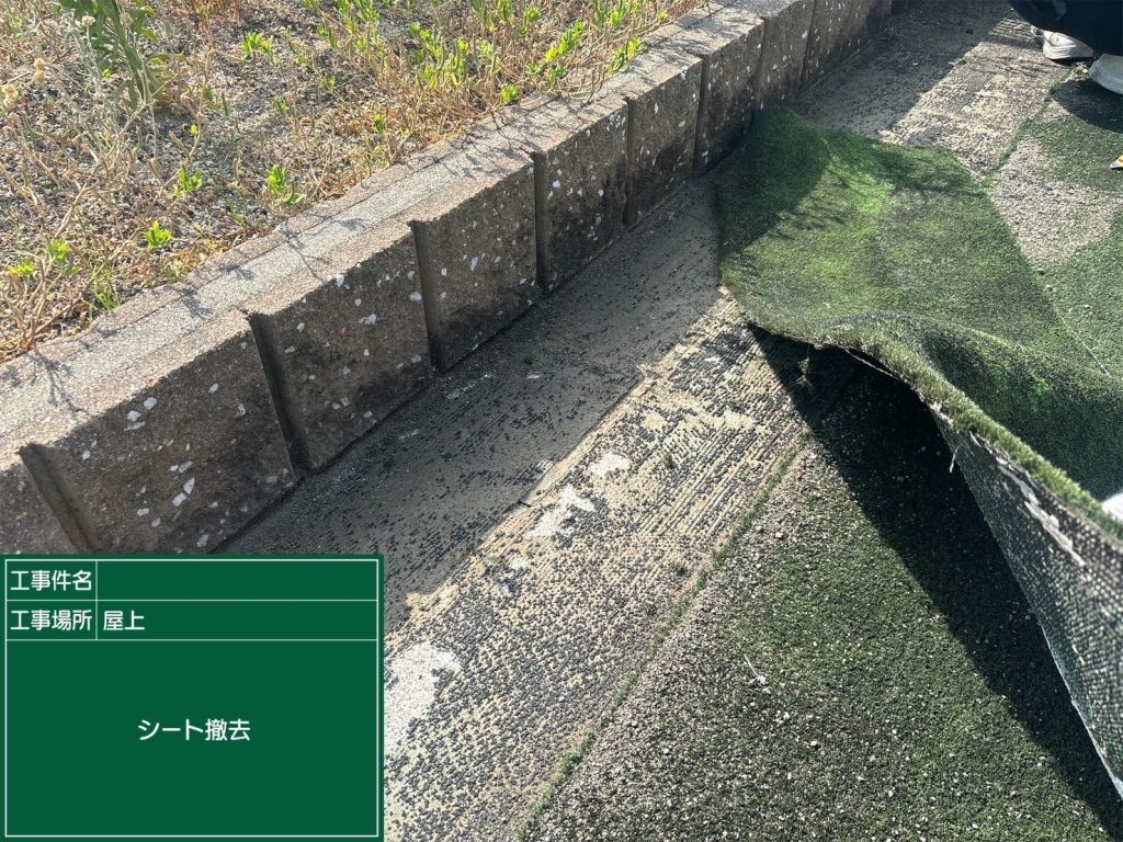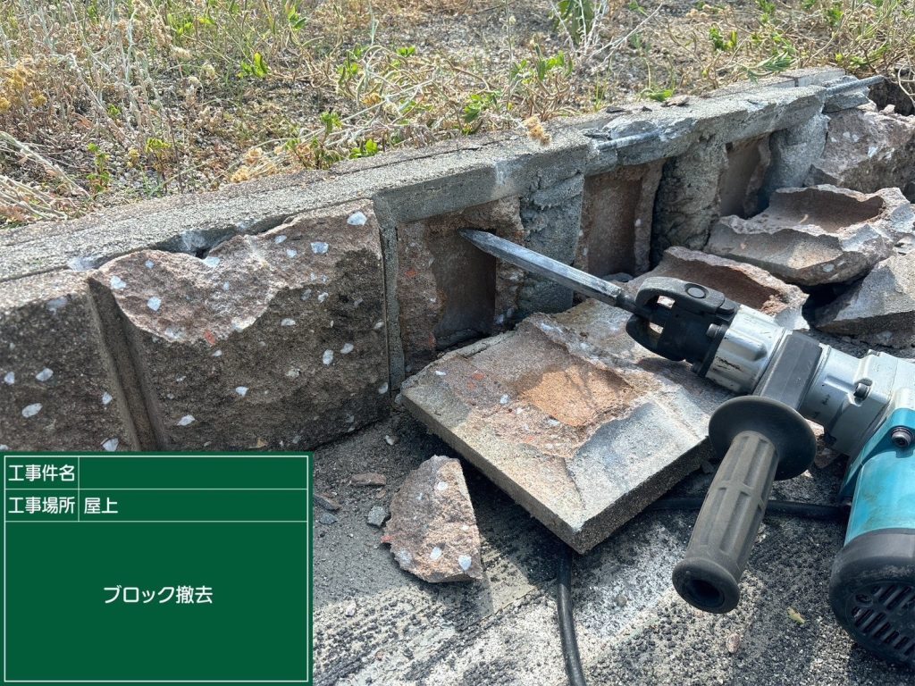屋上の立ち上がりに設置されていた古いブロックや部材を取り外します。撤去により、シート貼付けや下地補修の作業スペースを確保するとともに、今後の防水層の施工に支障が出ないよう整地します。