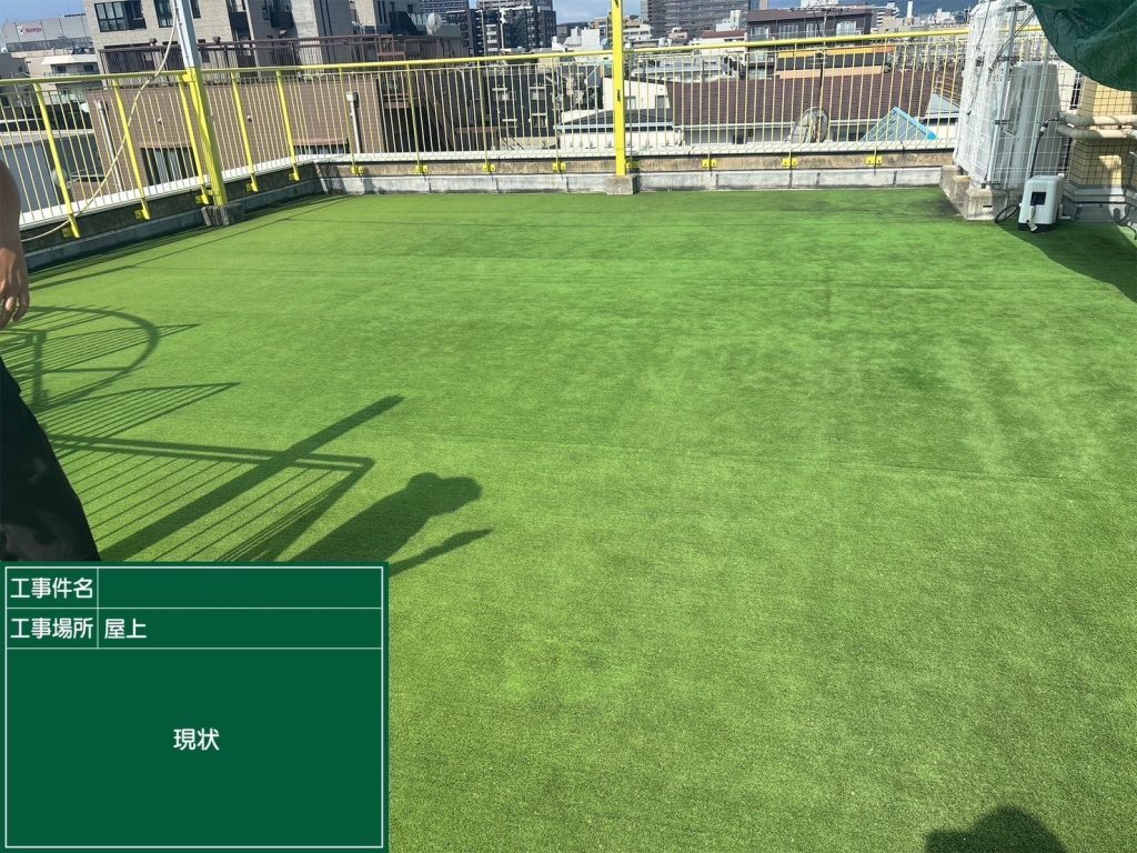 今回の現場では、屋上にシートが敷かれていました。長年の使用により経年劣化や破れが見られ、雨水の浸入や下地の劣化が心配される状態でした。まずは現状を確認し、必要な補修や防水工事の計画を立てることから作業を開始しました。