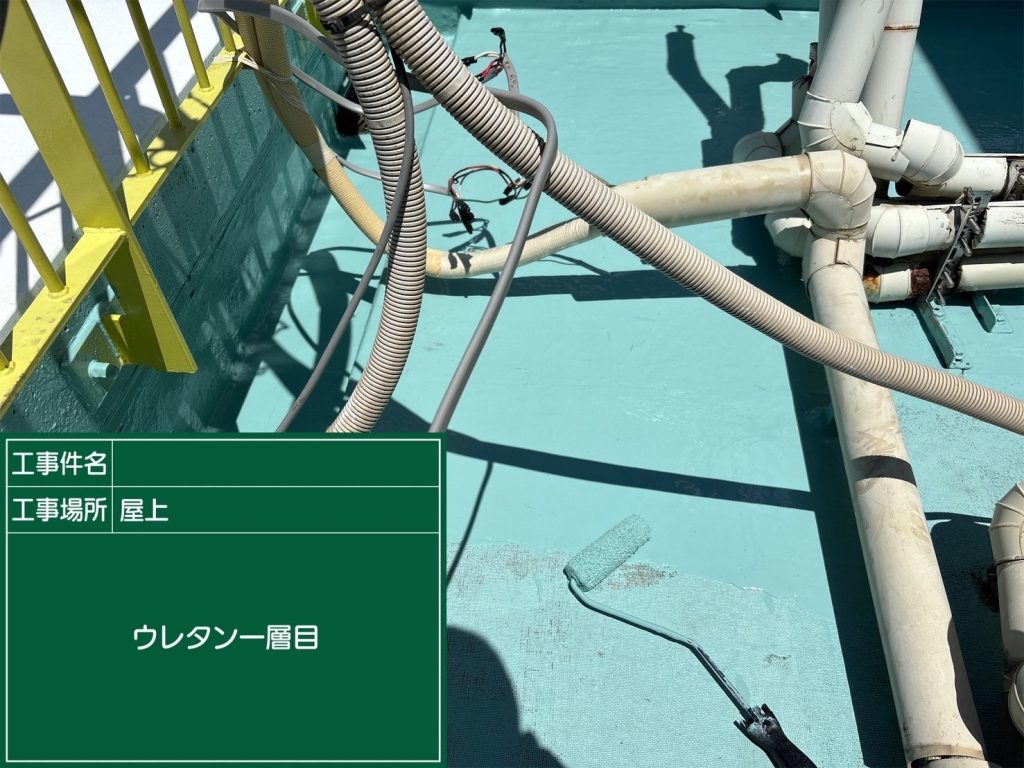 ウレタン塗膜防水を2層に分けて塗布します。1層目で下地と密着させ、2層目で厚みを確保することで、防水性を高め、屋上全体を水の浸入から守ります。