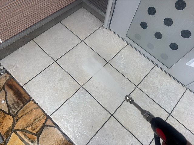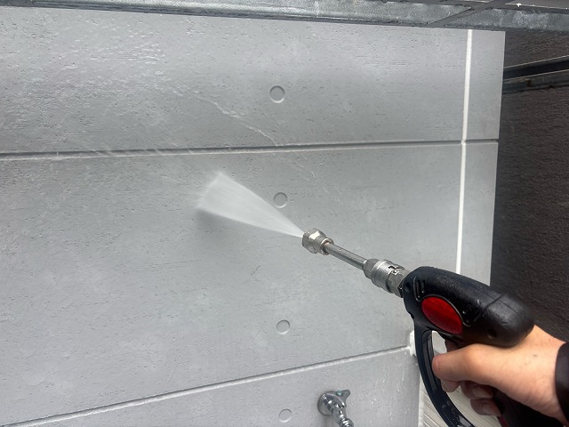 外壁や屋根の表面に付着した汚染物質や微生物を高圧水で取り除き、塗装の密着性を高めるための重要な下地処理作業です。