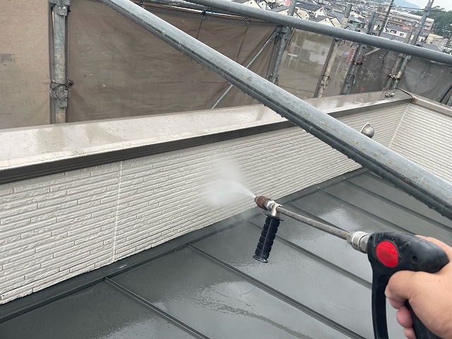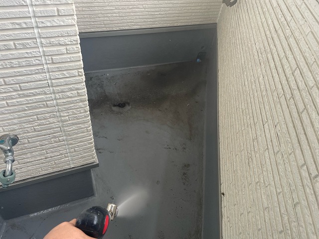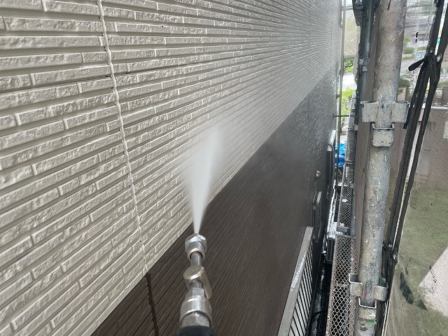 高圧洗浄は、外壁塗装を行う前の大切な下地処理工程です。長年の汚れやカビ、コケ、古い塗膜などを専用の高圧洗浄機で丁寧に洗い流し、外壁をキレイな状態に整えます。この作業をしっかり行うことで、塗料がしっかり密着し、仕上がりの美しさや塗膜の耐久性を長く保つことができます。