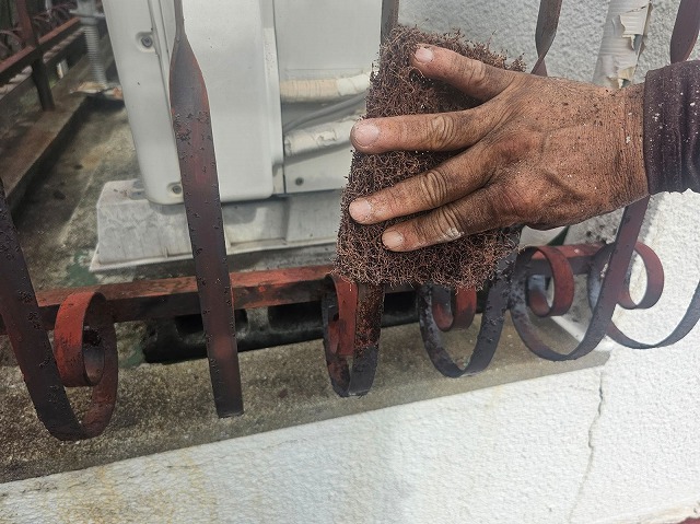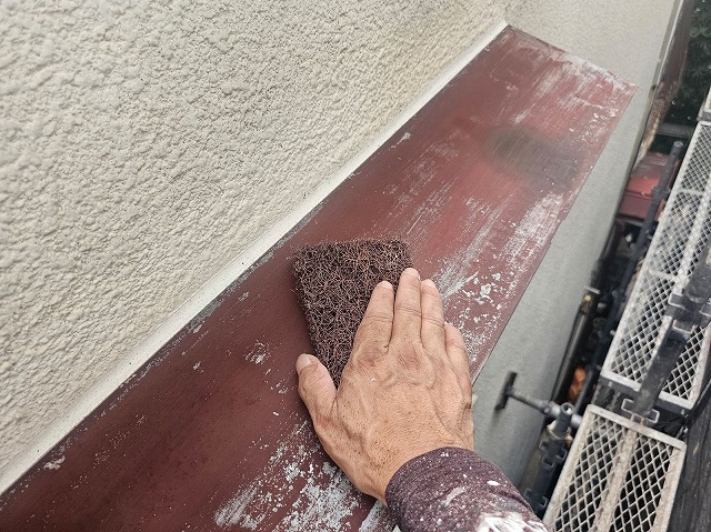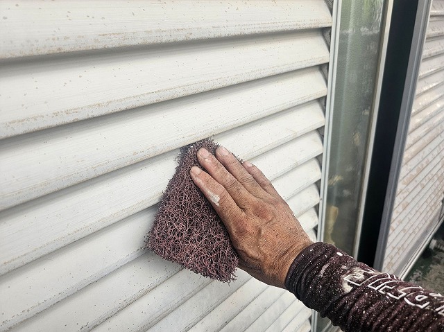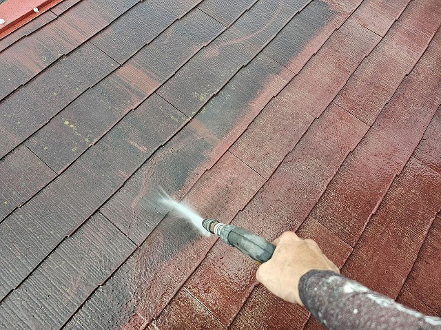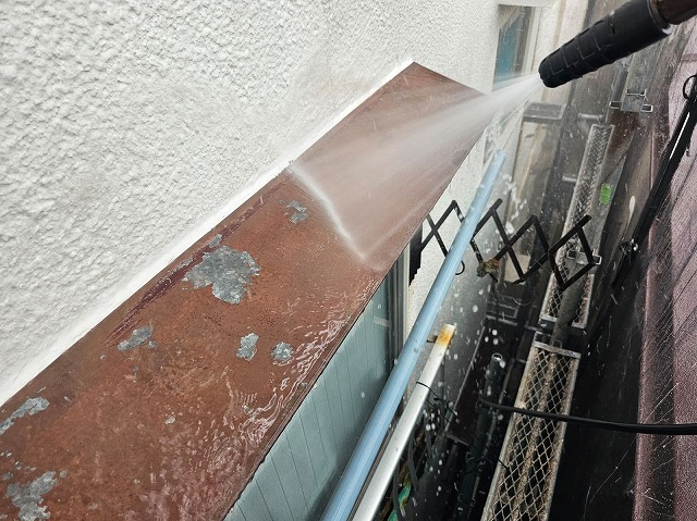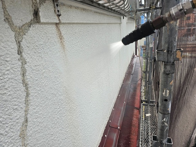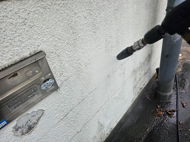 塗装前に汚れやカビ、古い塗膜を洗い流し、塗料の密着性を高めるための作業です。