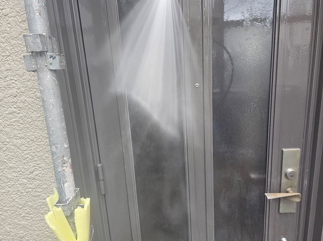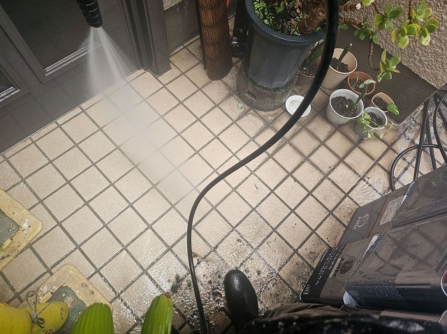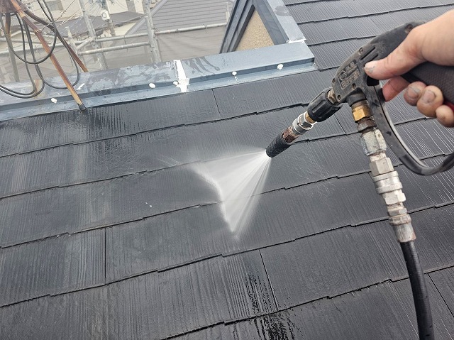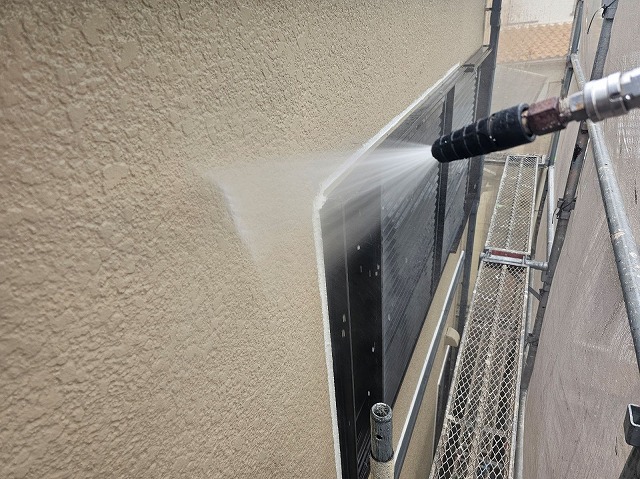 塗装の前段階として、汚れやカビ、旧塗膜を洗浄し、塗料の付着を良くする準備工程です。