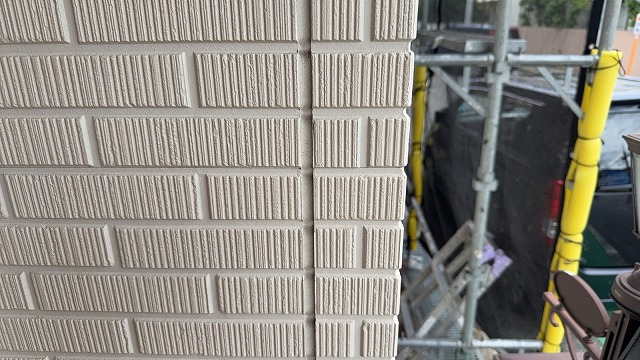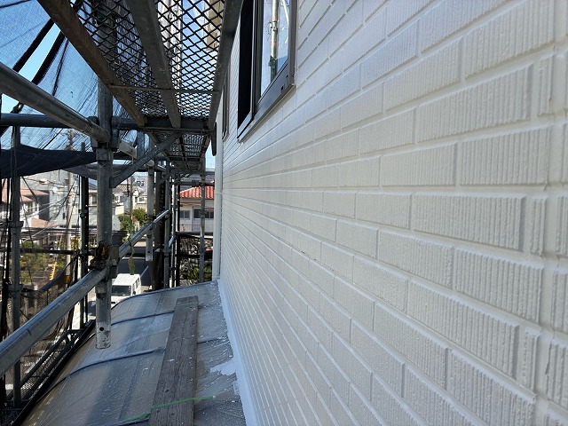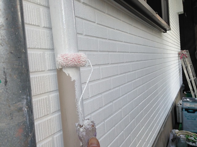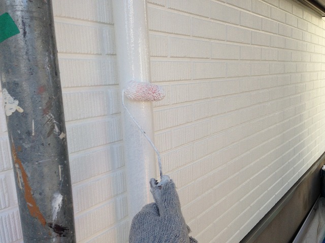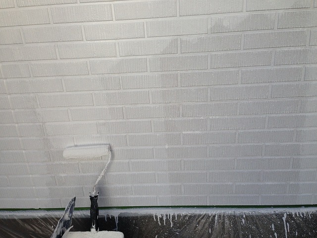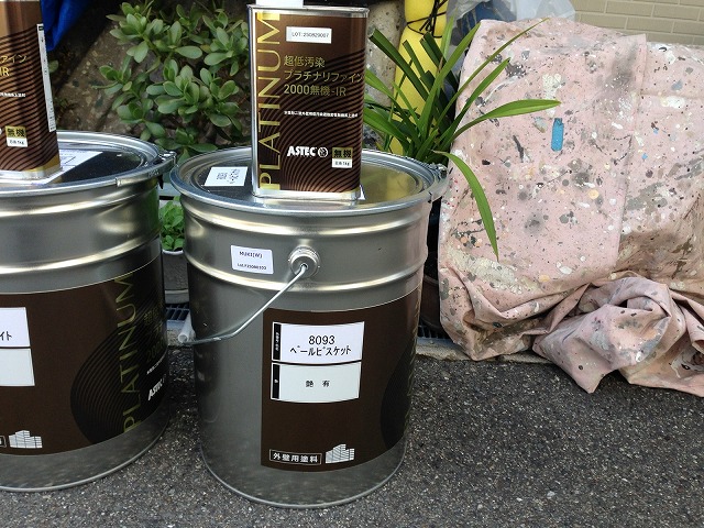 下塗り乾燥後、「超低汚染プラチナリファイン2000無機ーIR」で中塗り、上塗りをして外壁塗装の完成です。