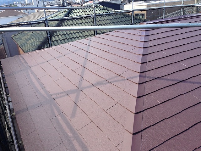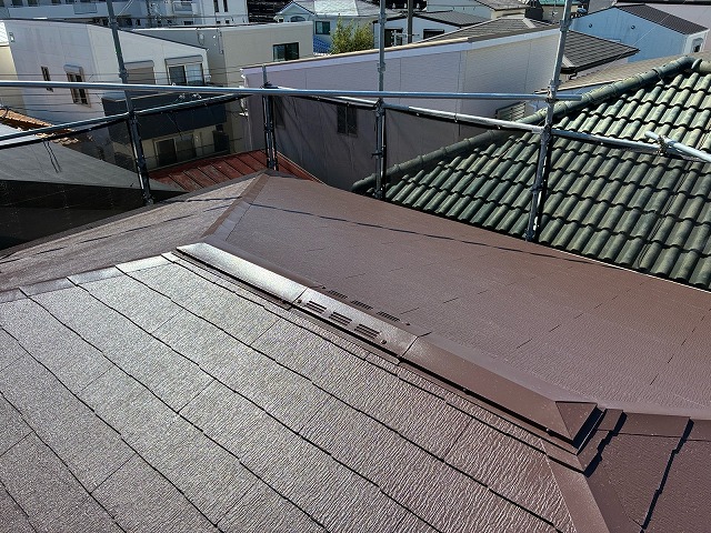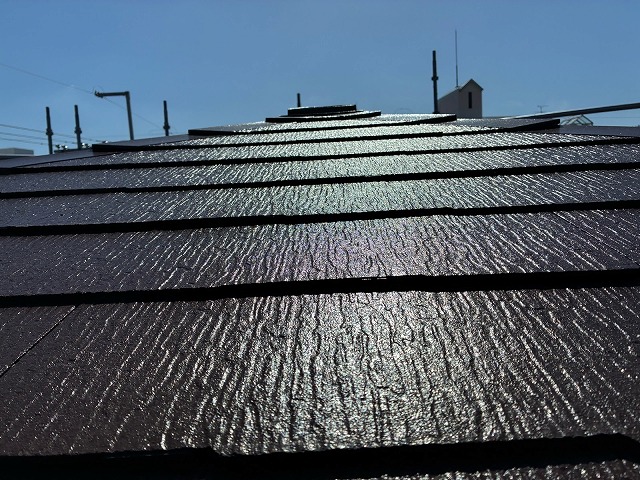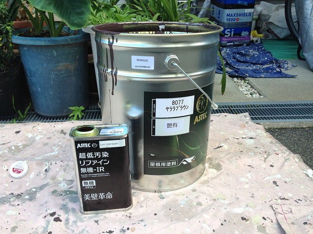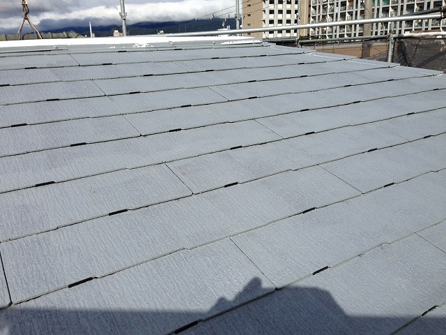 下塗り乾燥後、「超低汚染リファイン500無機-IR000無機ーIR」で中塗り、上塗りをして屋根塗装の完成です。