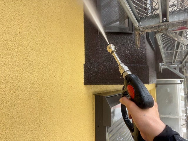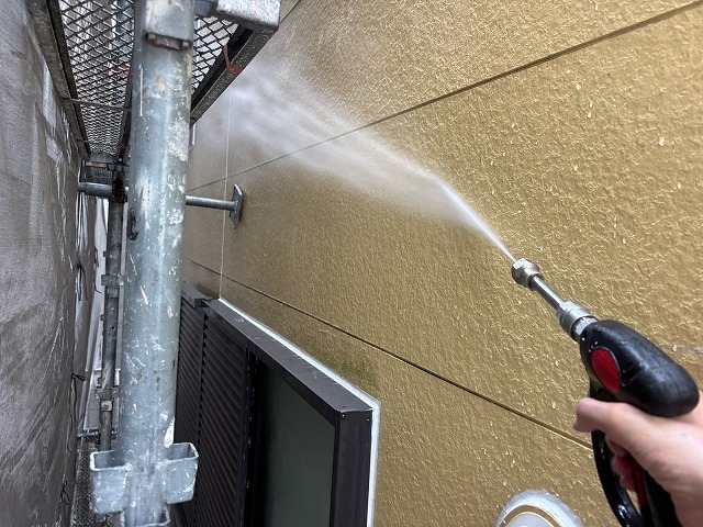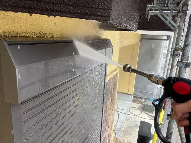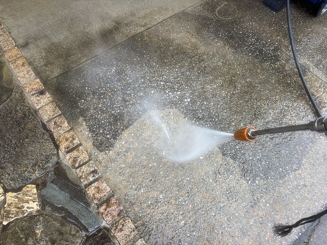 高圧洗浄機を使用してコケや藻、カビなどの汚れを落とします。