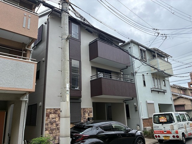 尼崎市M様邸 「超低汚染プラチナリファイン2000Si-IR」8075パイオニア×8081バーチグレーで外壁塗装、屋根は「スーパーガルテクト」シェイドブラウンでカバー工事を行いました!