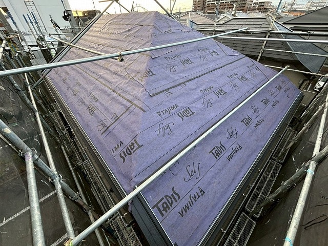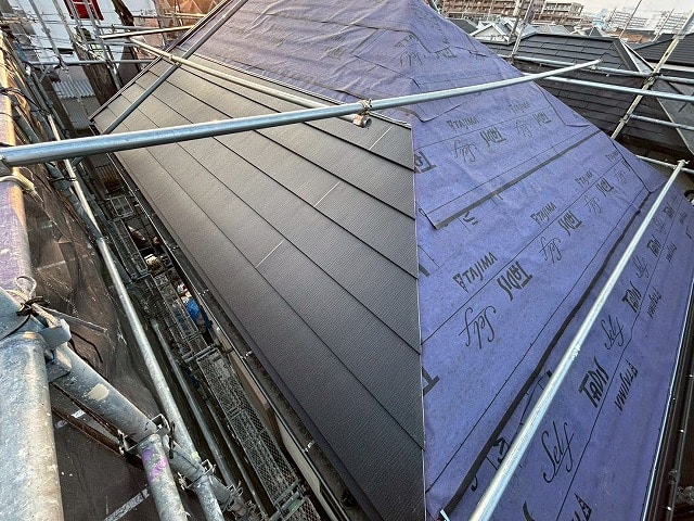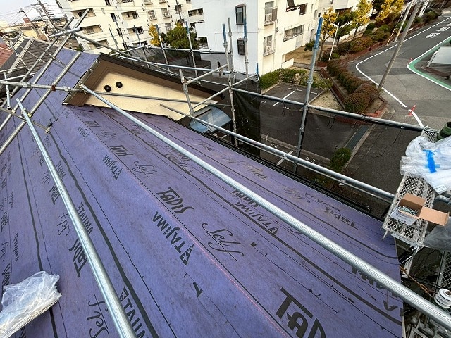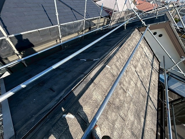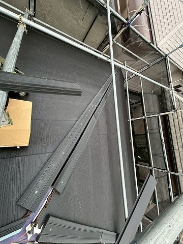 既存の棟板金を外して、防水シートを敷設し、新たに屋根材を設置していきます。