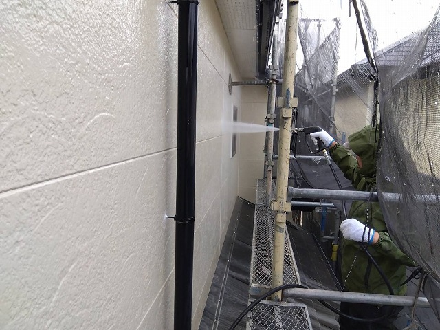 外壁にこびり付いたカビやコケ、長年の汚れを高圧の水流でしっかり洗い流し、塗料がしっかり定着するための下地を整える重要な工程です。