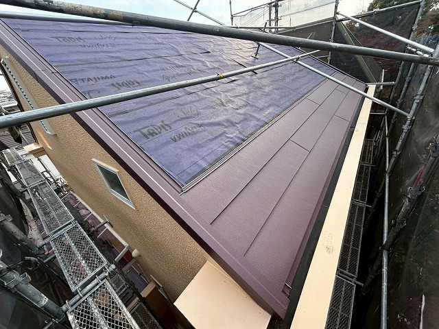 既存の屋根材を撤去せず、その上から防水シートを施工し、新しい屋根材を重ねて設置します。