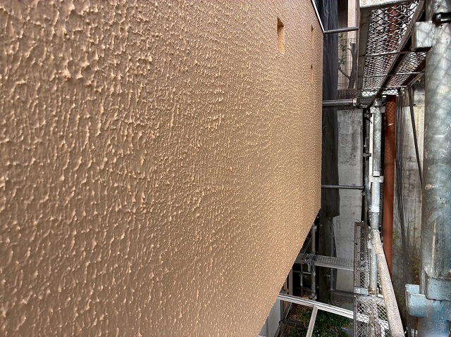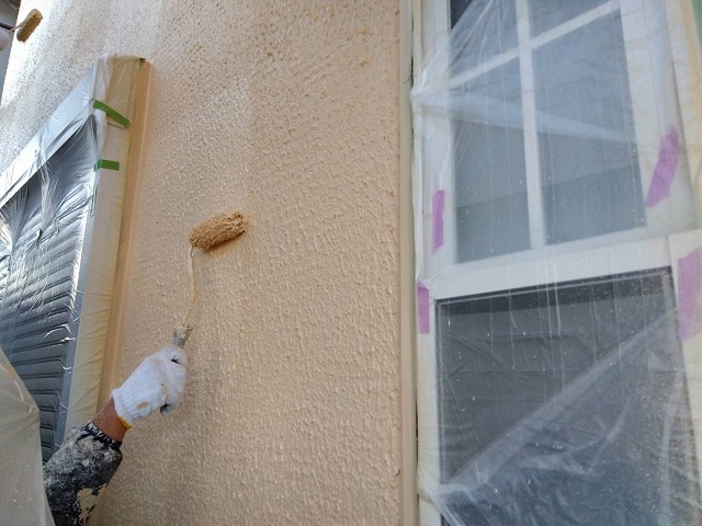 下塗り乾燥後、「超低汚染プラチナリファイン2000無機ーIR」で中塗り、上塗りをして外壁塗装の完成です。
