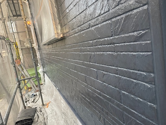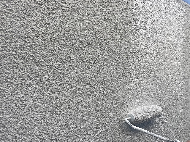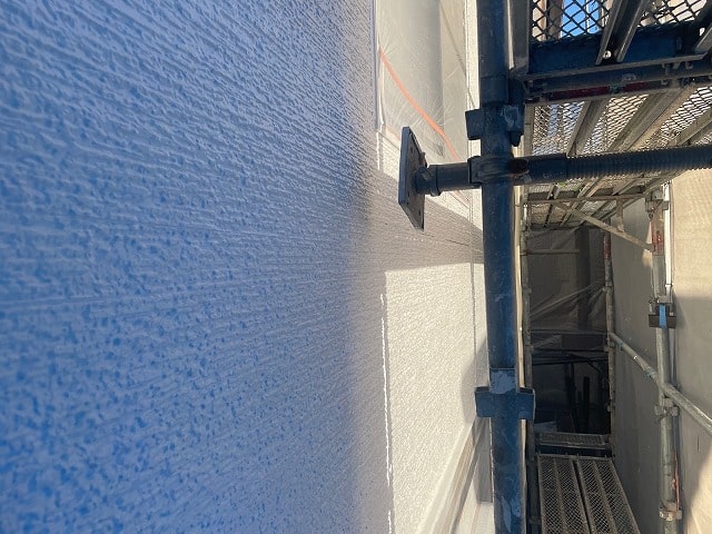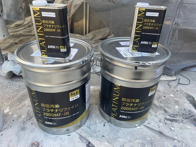 下塗り乾燥後、「超低汚染プラチナリファイン2000MF-IR」で中塗り、上塗りをして外壁塗装の完成です。