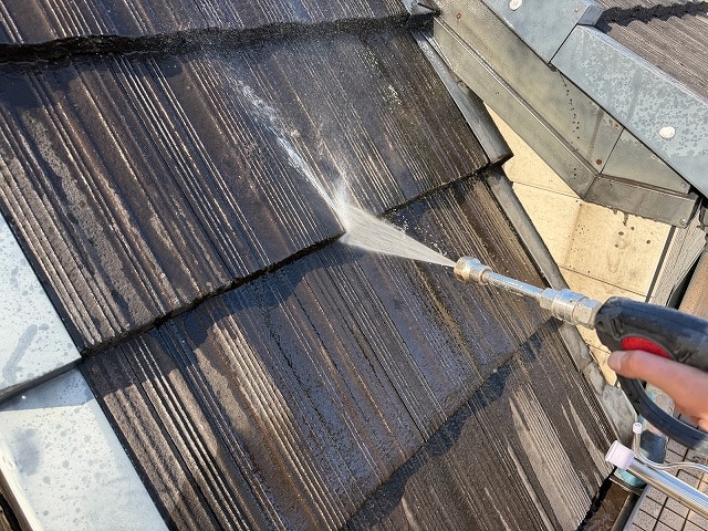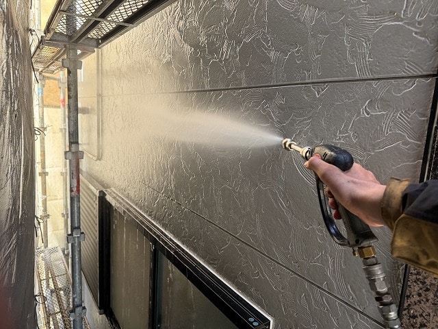 高圧洗浄は、外壁や屋根に付着した長年の汚れ、コケ、カビ、ホコリ、排気ガス汚れ、劣化した旧塗膜などを強い水圧で徹底的に洗い流す重要な下地処理工程です。表面をきれいに整えることで塗料の密着性を高め、塗膜の剥がれや不具合を防ぎます。仕上がりの美しさと耐久性を左右する、塗装前に欠かせない大切な作業です。